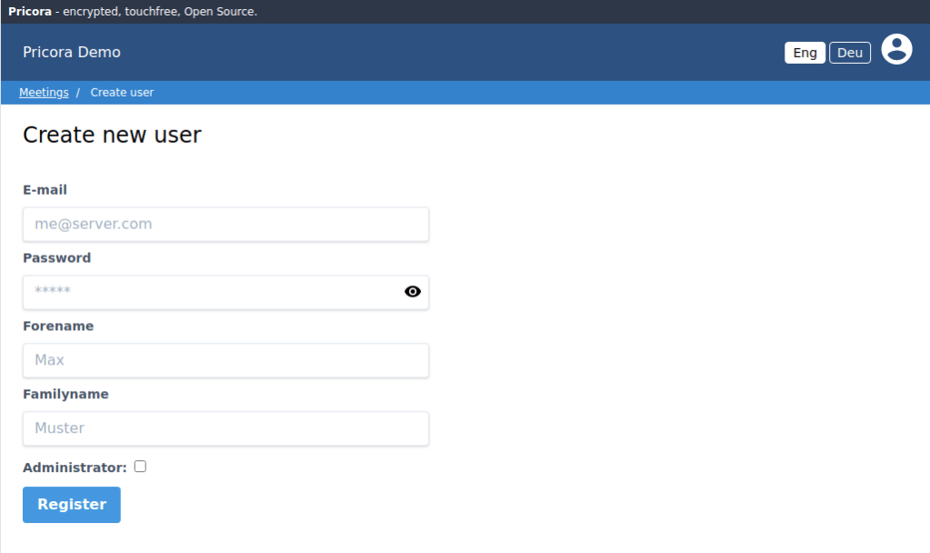 After you have changed your admin password, you should create accounts for other users. A user account is required to create meetings – it is NOT required to add contact information to an existing meeting. Everyone who is hosting meetings should receive a personal user account. E.g. each teacher at a school. If you intend to use Pricora alone, you do not need more users.