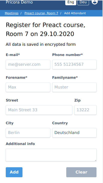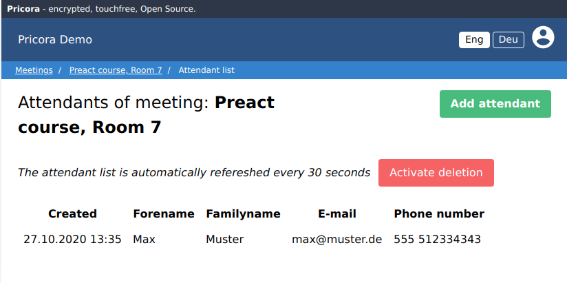 For data protection it uses an encryption system. All contact data is encrypted before being written to disk and can only be decrypted by the owner of the meeting using its password. Downside: Do not loose your password! User passwords can be changed (if you still know the old one), but they cannot be restored when you forget them. There is a feature around that should allow admin users to decrypt the contacts of meetings that people created – but that is also a complicated story. So keep the password’s save!